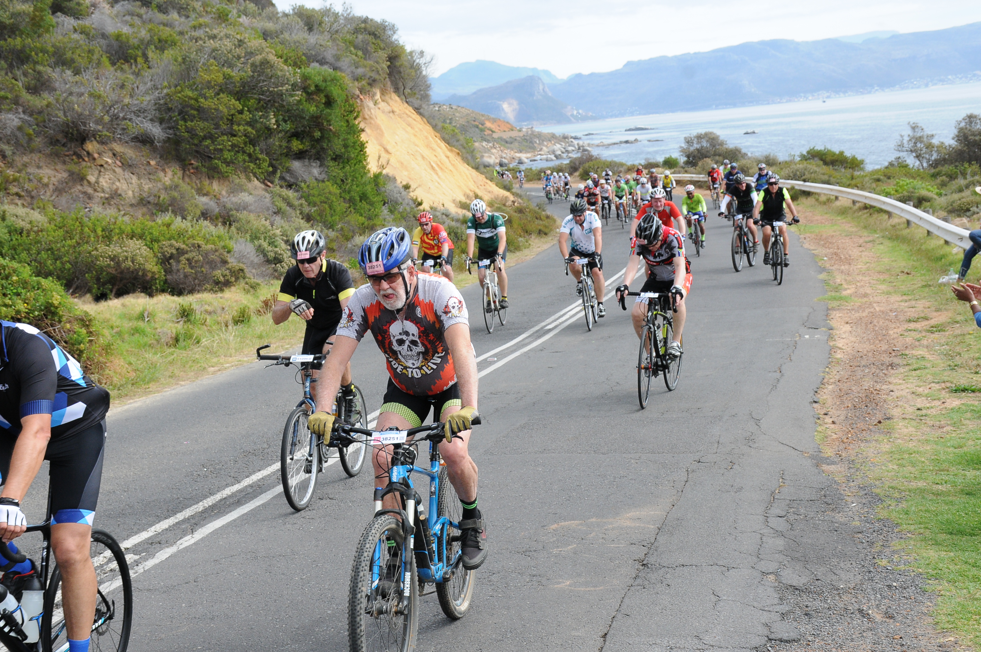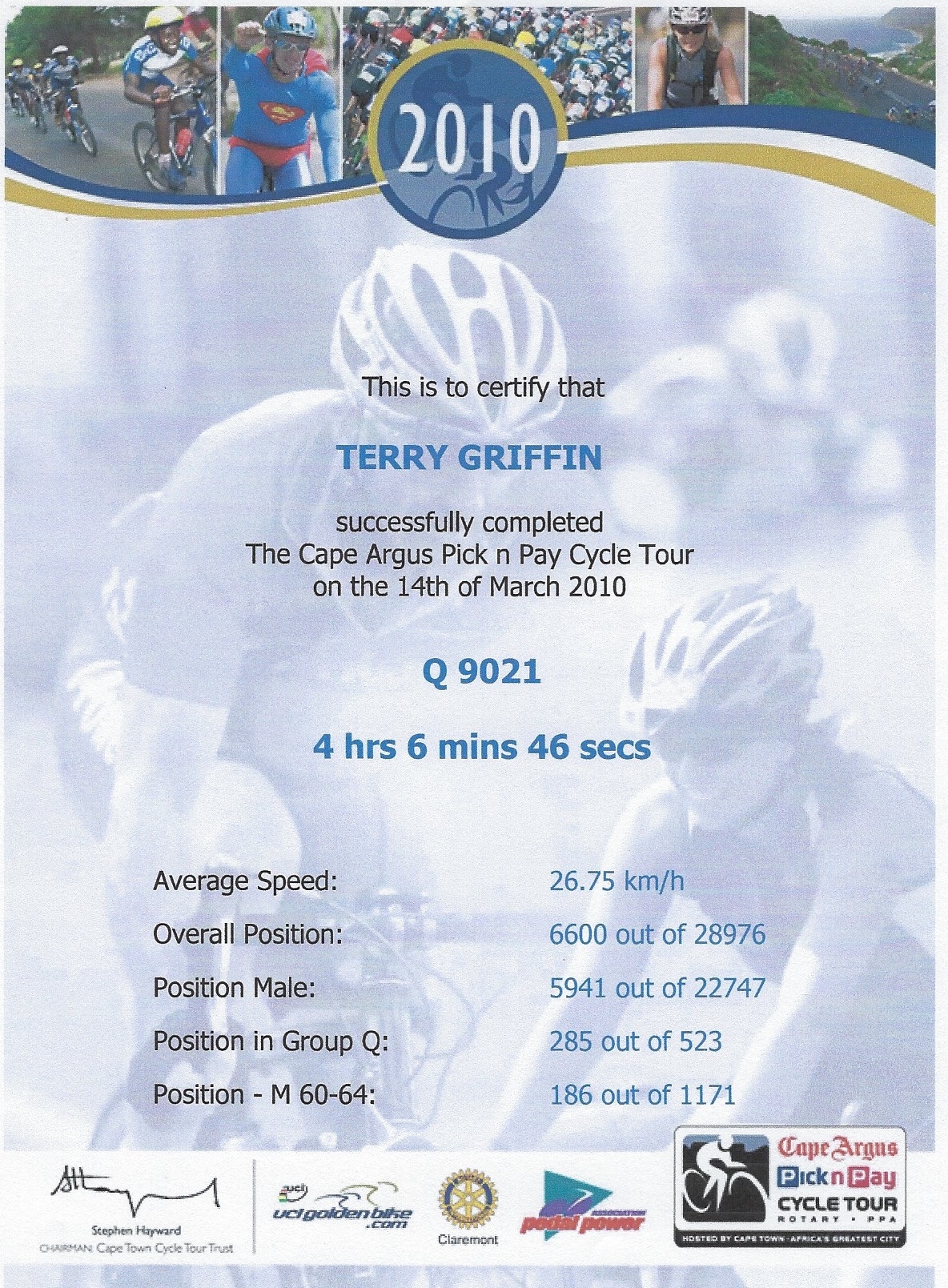 I was now living in Hermanus so I drove up to stay with my sister Norma on the Saturday. The weather was fine and hot with a gentle south-easter. Had a breakfast of FutureLife, toast and coffee and cycled through to the start, leaving at 7:16. Windy through Fish Hoek but otherwise uneventful with a single stop to leak. Living in Hermanus with no car I had done a great deal of cycling, and in fact I was probably over-trained, accounting for my rather disappointing time. Four of my last five rides had been over 4 hours.