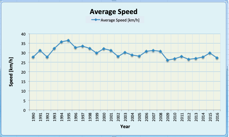 Average Speed: From a PB in 1995, a slow but consistent slowing down.
