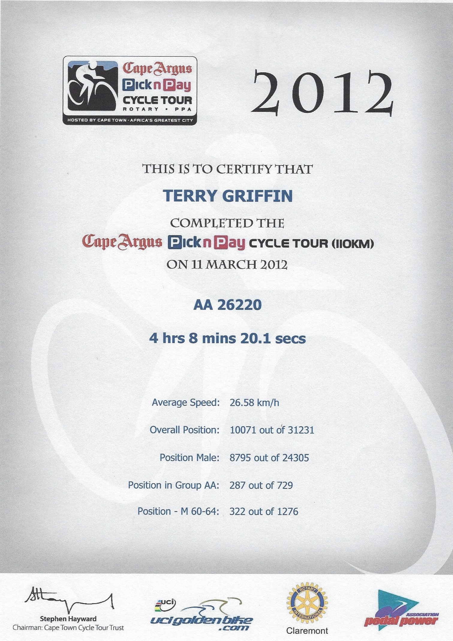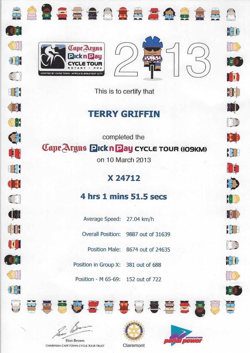 This was the first year that the Expo was held at the Cape Town Stadium, and it was pretty poor. I again drove up on the Saturday afternoon to Norma's house, where my brother Paul was back for a second year. I rode through to the start and set off at 7:17 on a beautiful day. Norma and I had a beer afterwards, but Paul was so far behind us that we didn't wait. It was also my worst ever overall position. We had a pleasant celebratory braai in the evening. As it happened, it was my last proper Argus!