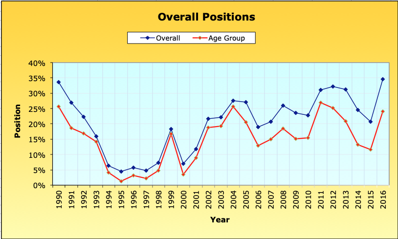 Overall Positions: This shows my finishing position both overall and within my age group at the