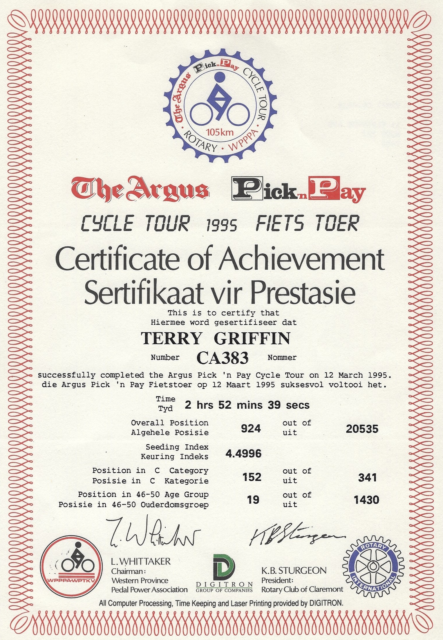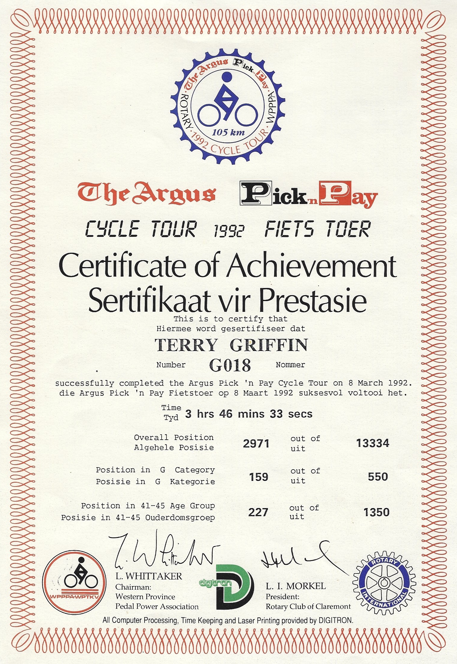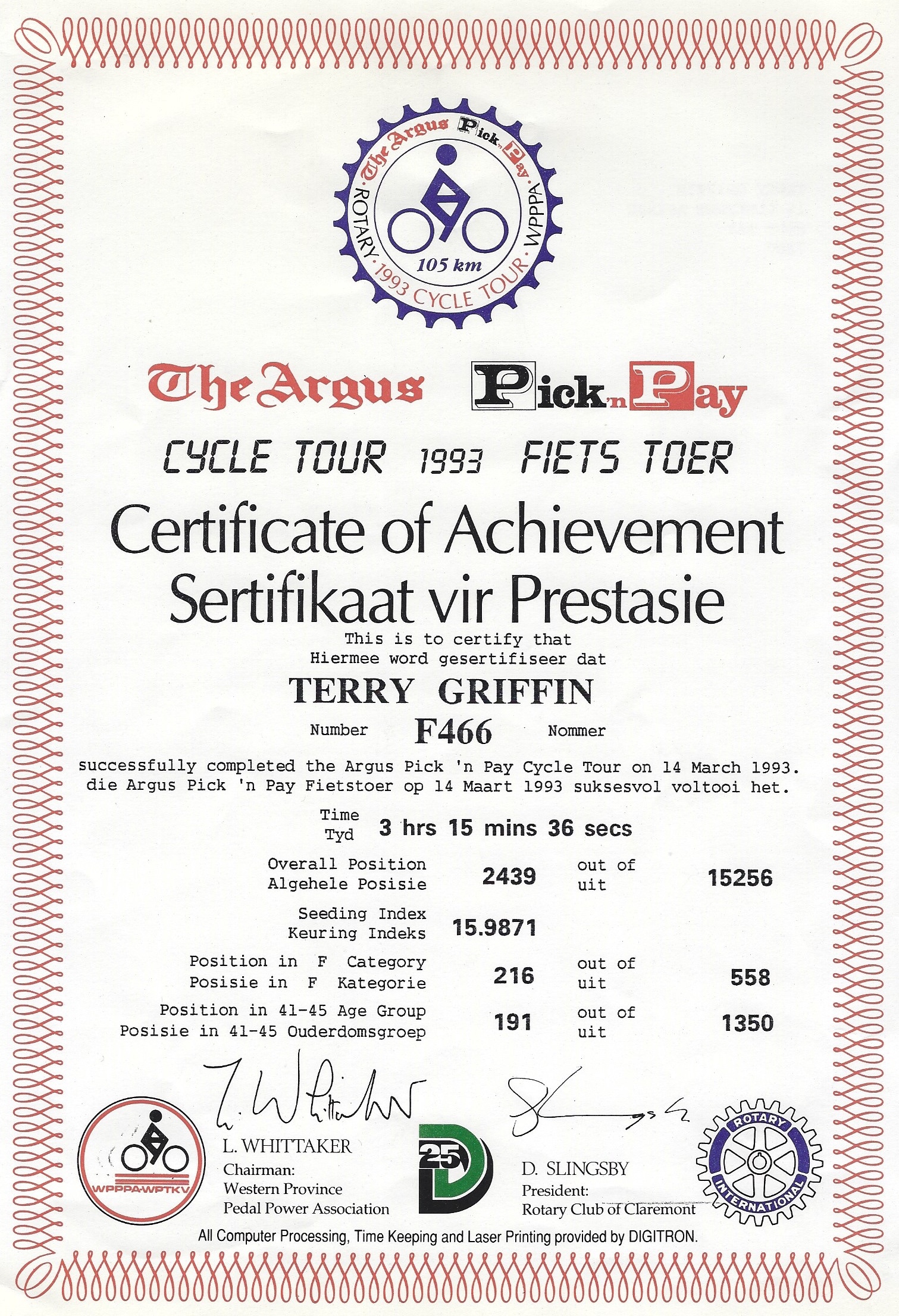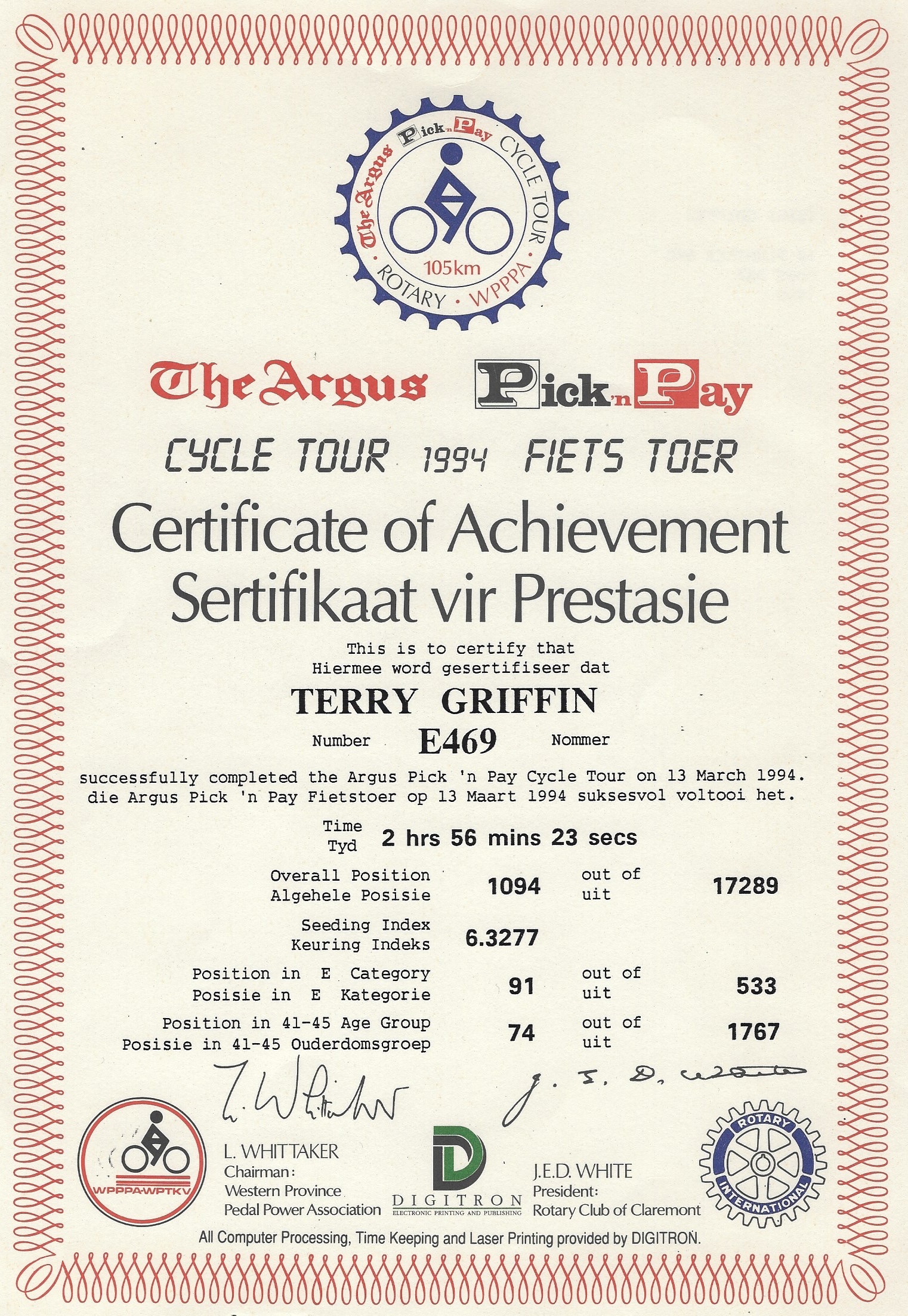 Towards the end of 1989 my friend Eric Newton sold me his elderly Raleigh bike and persuaded me to enter the Argus. He and a number of other friends had already been doing the Argus for a few years: Pete de Jager, Sean Pope, Steven Bertie-Roberts, and others. Since I was living in Hout Bay at the time, my first training ride was half way up Chappies!