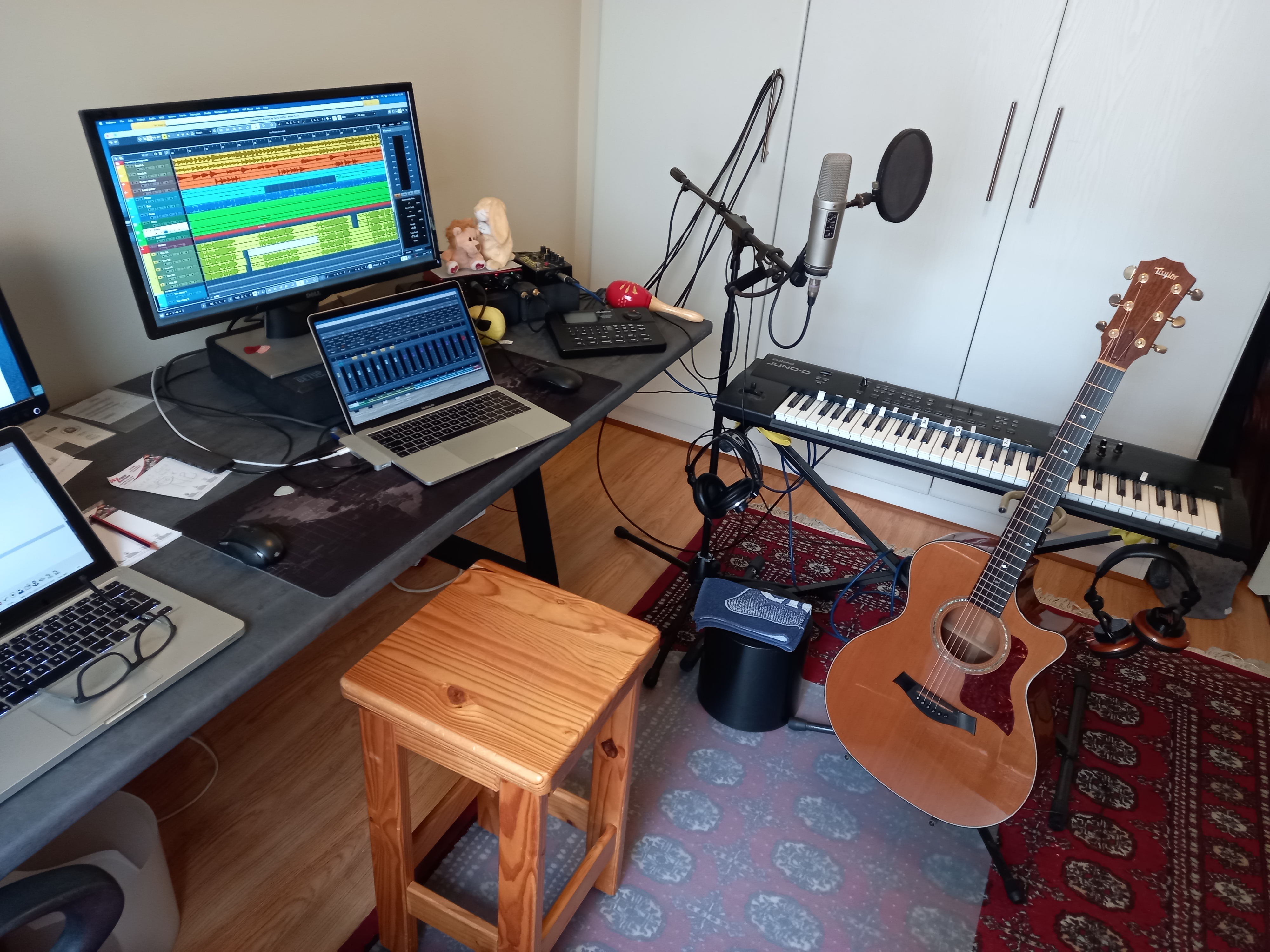 My vocals are recorded through a Rode NT2-A microphone. I record my acoustic guitars through the Rode NT2-A microphone (and I may use a Shure SM58 on occasion) but have recently started recording my Taylor directly into the audio interface (to give it more twang!).